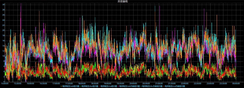 SVG運行后電網電壓穩定,功率因數高于0.95,諧波、負序及電壓閃變等電能質量問題得到明顯改善。在并網點電能質量明顯提升的同時,用戶水力發電機組運行狀況也得以改善,電弧爐工作時,水力發電機組的有功功率波動小于1MW。